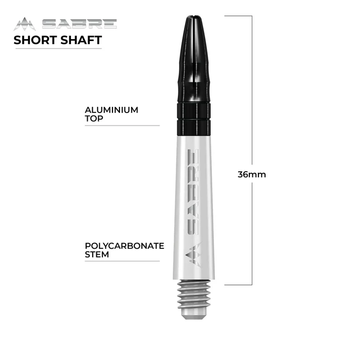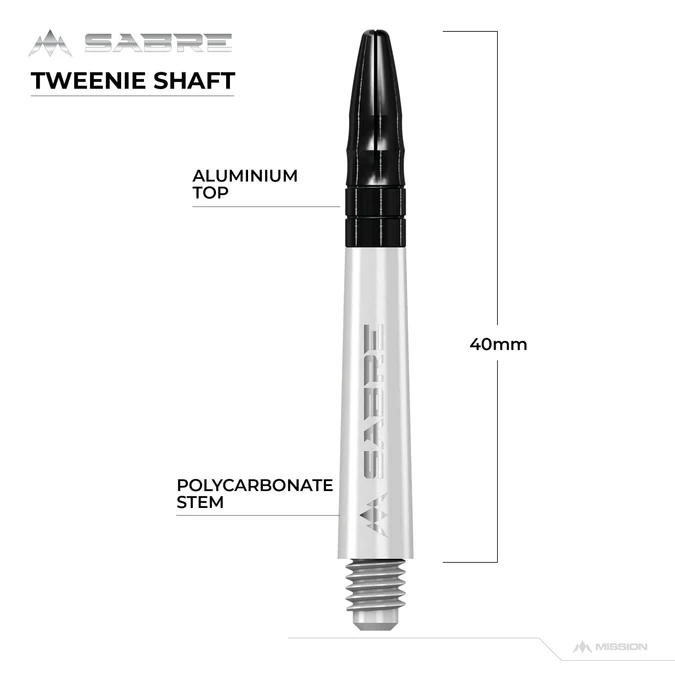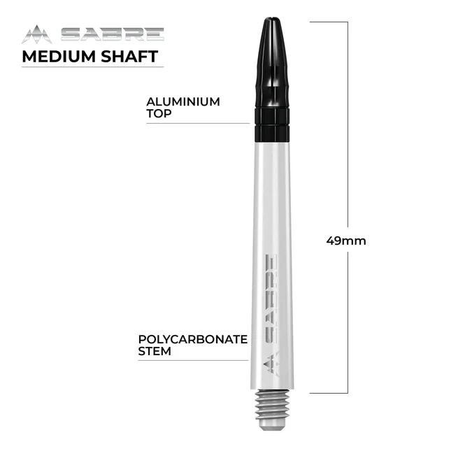 The Mission Sabre Dart Shafts combine the lightness and strength of polycarbonate with the flight-grip of Aluminium shafts. The Sabre shafts are made from a strong black Polycarbonate material, encasing an Aluminium core and fixed top. The Aluminium tops enhance the grip of the flight and are available in a choice of six colours (black, blue, gold, green red and silver). The shafts are available in four sizes: Small (36mm), Tweenie (40mm), Tweenie Plus (44.5m) and Medium (49mm). Please note that sizes do not include the thread. Each pack contains three shafts. Mission Sabre Shafts - Polycarbonate Dart Stems - White - Black Top - Medium
